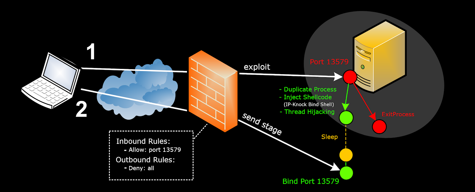 Well, the goal of this approach is that once the corresponding service is exploited, the shellcode generates a new process in which it will inject the payload responsible for configuring the bind shell in the appropriate port. However, there are two problems here. The first and more important is that if you try to run a bind shell in the address space of a process, by default, Windows firewall will block it (most of the POCs I have seen migrate to a different process, for example cmd.exe, however, in practice this is not feasible precisely because of the Windows firewall). The second minor problem is that, even if the firewall allowed to open the socket, we would have to wait for the legitimate process (the one we just exploited) to finish its execution since we have to bind it in the same port (some shellcodes configure a kind of loop that tries to bind it until the main process "releases" it).